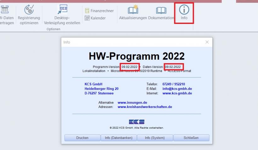 Nachdem diese Funktion ausgeführt wurde, bitte auf "Hilfe / Info" klicken um zu überprüfen, dass Programm und Datenversion übereinstimmen.