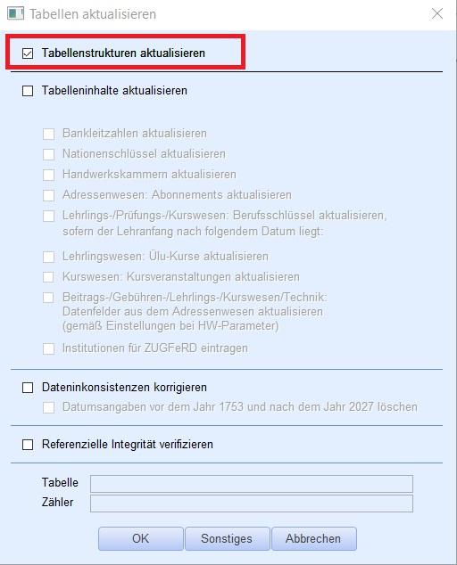 Es ist absolut wichtig, nach Update des Programmes auch die Datenbank zu aktualisieren. Hierbei werden für neue Programmierungen notwendige weitere Tabellen oder auch Spalten in bestehenden Tabellen angelegt. Wird keine Datenbank-Aktualisierung vorgenommen, ist es möglich, dass innerhalb des Programmes verschiedene Dinge nicht funktionieren (z.B. in bestimmten Datenfeldern #Name? auftaucht)