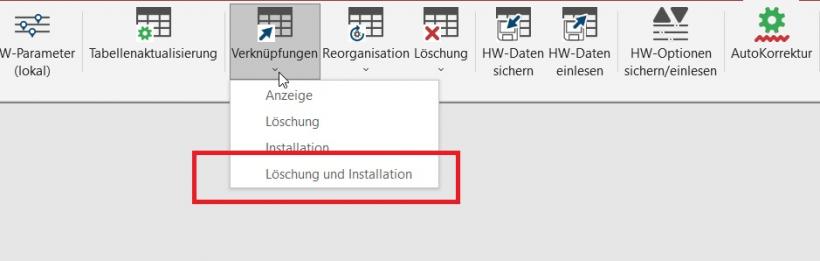 - Verknüpfungen löschen und installieren Durch die Aktualisierung der Datenbank wurden neue Tabellen und Tabellenspalten in die Datenbank integriert. Damit diese ordnungsgemäß angesprochen werden können, ist es erforderlich, die Verknüpfungen zwischen Programm und Datenbank zu lösen und neu zu verknüpfen. Dies geschieht mit dem Menüpunkt "Extras / Verknüpfungen / Löschen und installieren"